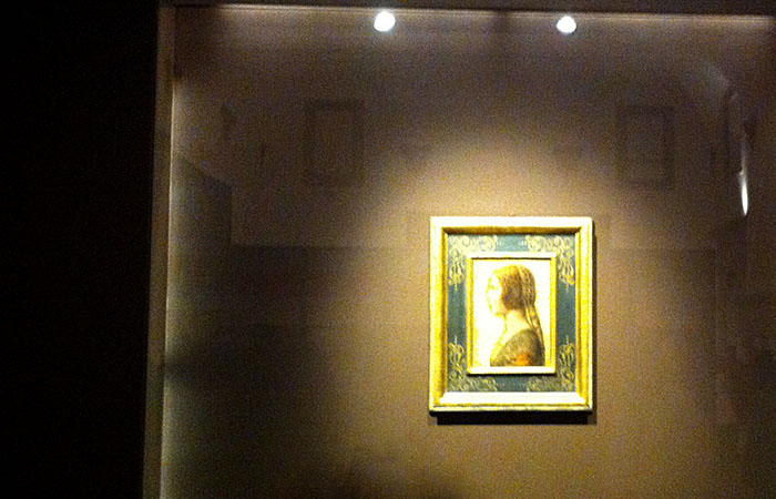 La Bella Principessa di Leonardo è una giovane ragazza ritratta di profilo con i capelli raccolti dall’acconciatura detta “coazzone” tipica della corte degli Sforza. Probabilmente si tratta di Bianca Sforza, figlia illegittima del Duca di Milano e di Bernardina de Corradis che a soli 10 anni fu promessa sposa a Galeazzo Sanseverino che in seguito la sposo.