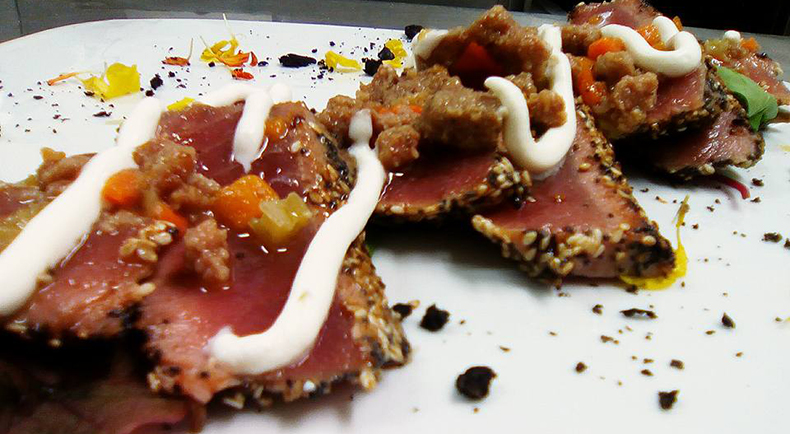 Sul secondo devo dire la verità, l’accostamento: tagliata di Tonno, ragù di ciauscolo e salsa lime che leggo sul menù, anche se davvero spinto, mi incuriosisce. Il problema è che, qui lo dico qui lo nego, suppur maceratese doc, non vado molto d’accordo con il ciauscolo e la sua percentuale di aglio. E allora forse mi butterei su una, pur sempre originale, porchetta di spada con salsa al Curry.