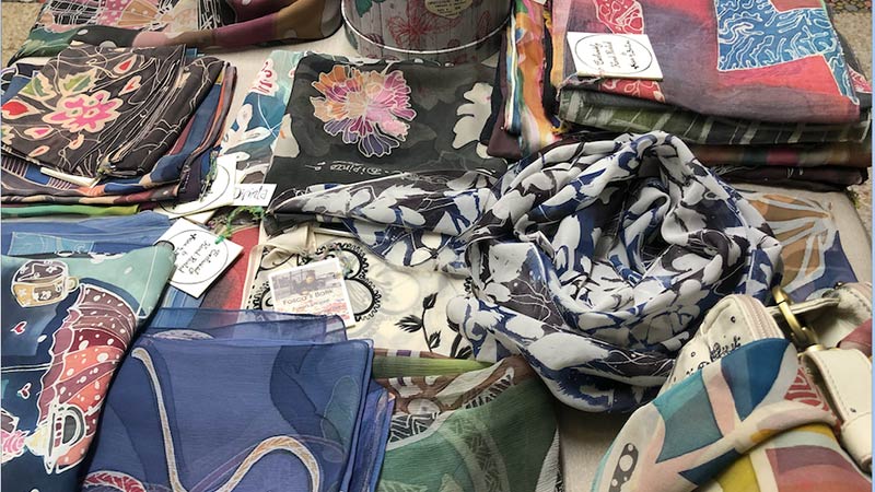 Il punto di forza di Fosca sono i foulard di seta, davvero bellissimi, disponibili anche con l’accoppiamento in cotone e cachemire. Ma Fosca dipinge inoltre t-shirt, vestiti, borse, scarpe, ma non solo abbigliamento visto che decora anche tessuti per l’arredo casa: tende, tovaglie e tovagliette o quadri personalizzati.