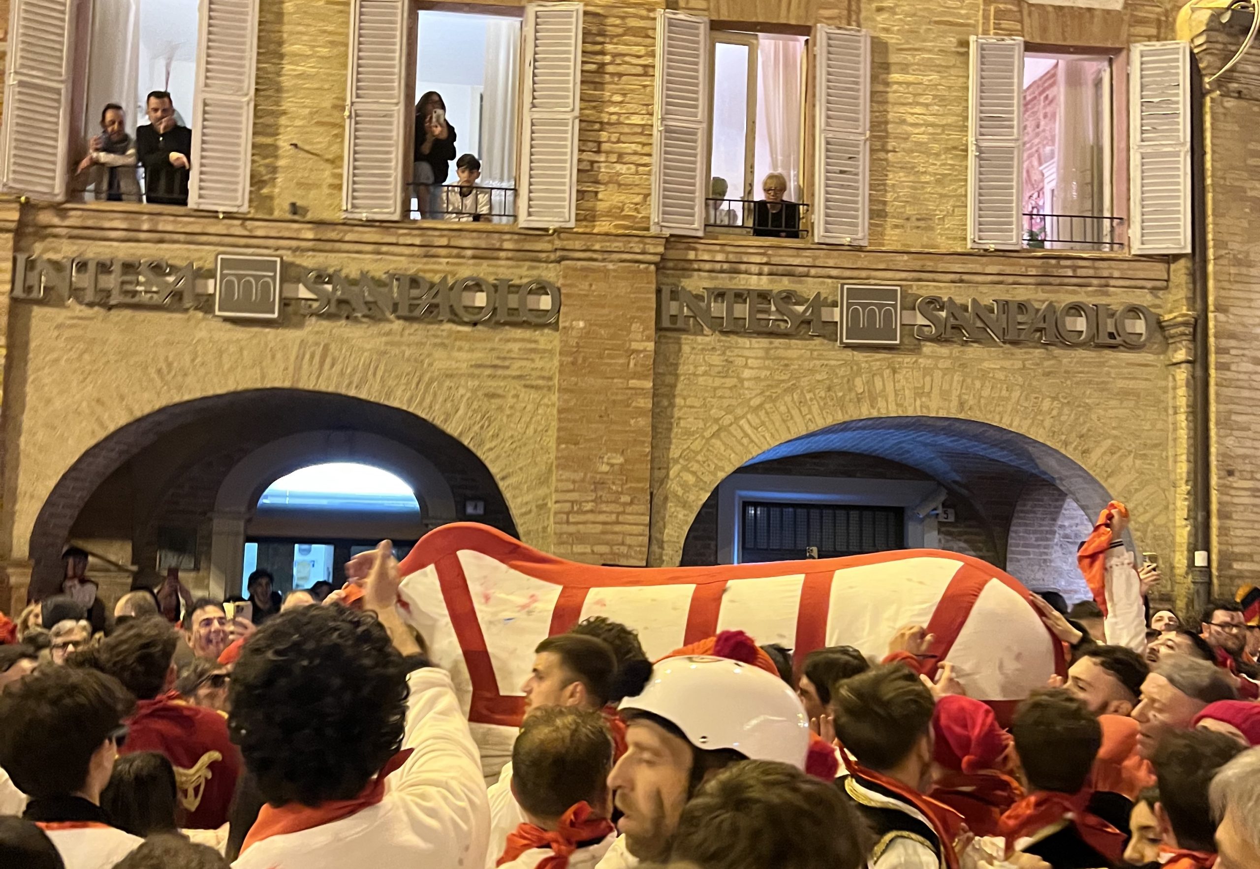 Non è finita qui. Dopo la “morte” simbolica, la testa del bove viene coperta con un drappo rosso e inizia il suo funerale. Una banda improvvisata, composta dai membri delle varie congreghe, suona l’inno del Carnevale Offidano: “Addio Ninetta, addio”.
