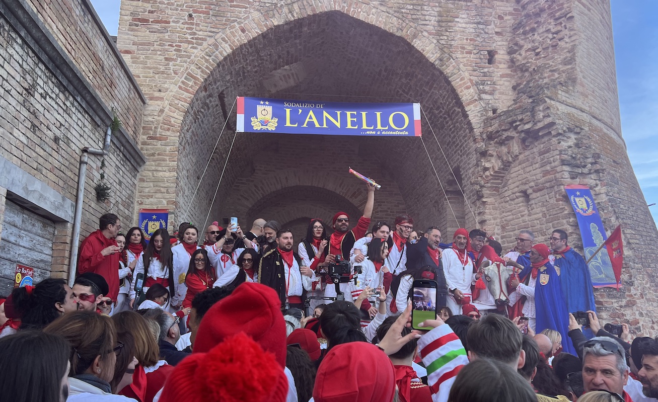 Verso le 17:30, dove aver fatto diverso volte su è giù per le voe del borgo e le strati circostanti, il bove arriva in piazza, dove si svolge una sorta di corrida accompagnata da musica spagnola. Qui l’atmosfera cambia: complice anche qualche bicchiere di vino rosso — Offida è nota per le sue cantine — tutto diventa ancora più surreale ed euforico.